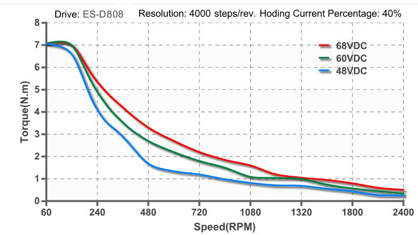 When driven by Leadshine low voltage easy servo drives (closed loop stepper drives), the position loop between ES-M23480 and the drive is closed. You will never get stall or loss of steps, often seen in open loop stepper systems. Because there is no torque resolution needed like in open loop stepper systems, you can much better high-speed performance than open loop stepper systems by increasing up to 30%.