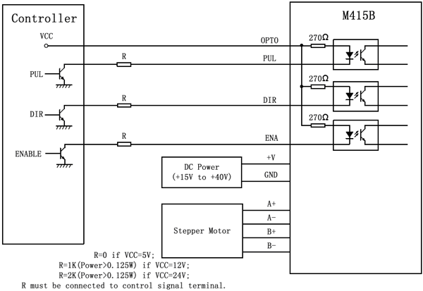 AMT offers matching power supplies for M415B. Those power supplies were specially designed to handle back EMF from stepper or servo motors in motion controls.